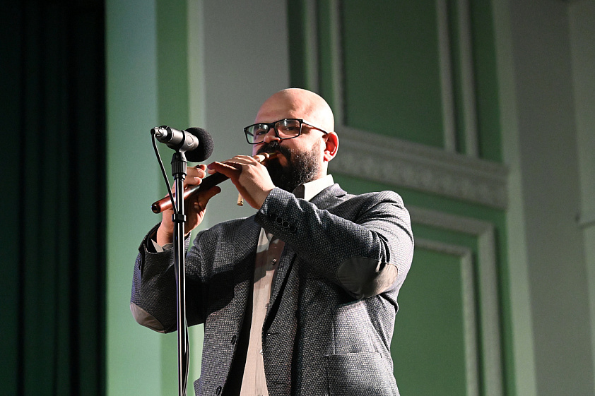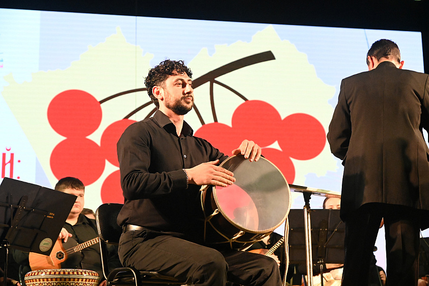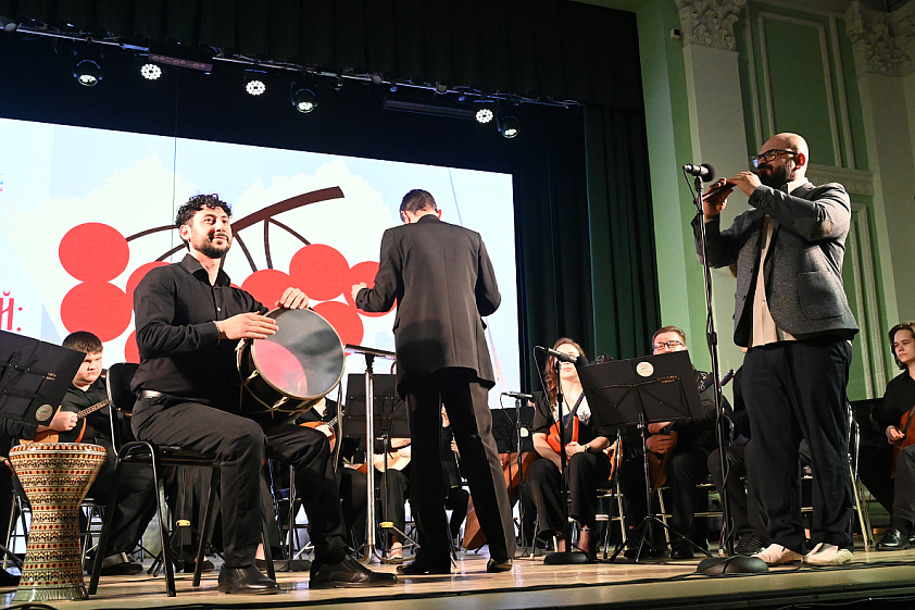 Одним из ярких номеров этой обширной программы стало выступление оркестра русских народных инструментов АГИК под управлением Дмитрия Домошонкина вместе с музыкантом и педагогом Арутюном Давтяном, виртуозно владеющим дхолом — армянским барабаном, история которого насчитывает несколько тысяч лет.
