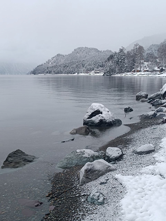 В телеграм-канале Алтайского биосферного заповедника опубликовали кадры окрестностей села Яйлю и берега Телецкого озера, покрытого снегом.