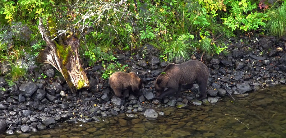 На видео запечатлены два бурых медведя — молодой и подросток, которые спустились со склона на берег озера и заинтересованно обследуют его, обнюхивая и переворачивая камни. В какой-то момент более взрослый косолапый отвесил оплеуху молодому, чтобы тот не лез к особо многообещающим камням. Медведи отличаются по цвету: более взрослая особь тёмно-бурая, а младший — золотисто-коричневый. В кадр также попала умиротворяющая прибрежная панорама.