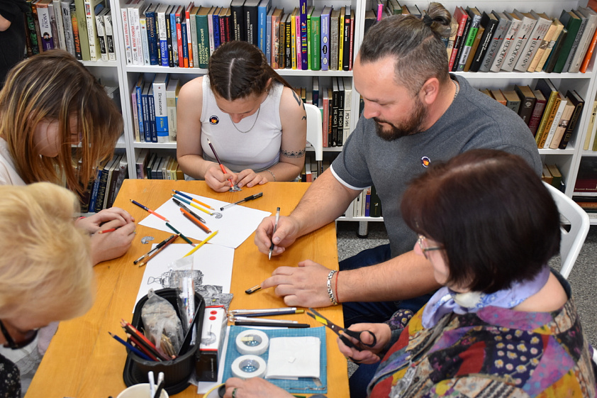 Побывать на втором этаже стремились те читатели, кто не любит сидеть на месте. Здесь у них была возможность пройтись по ярмарочному ряду, где были представлены работы барнаульских художников и ремесленников. Больше всего посетителей собралось возле Екатерины Витвиновой — художницы, работающей в стиле «декоративный наив». Когда-то свои трогательные картинки, созданные с помощью акрила, Екатерина перепечатала на открытки и магнитики, которые в «Библионочь» пользовались большим спросом. В соседнем зале можно было поучаствовать в мастер-классах по созданию собственного рисунка. Так, педагог Алтайского краевого детского экологического центра Валентина Мещерякова обучала всех желающих ботаническому рисунку, отражающему мельчайшие детали устройства того или иного цветка.