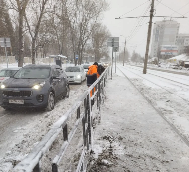 Работы по очистке тротуаров проводятся на улицах Христенко, 65 лет Победы, 280-летия Барнаула, в Шлиссельбургском проезде, Димитрова, проспектах Строителей, Красноармейском, Социалистическом. Тротуары посыпают на улицах Взлётной, Сергея Ускова, проспектах Социалистическом, Калинина, Комсомольском.