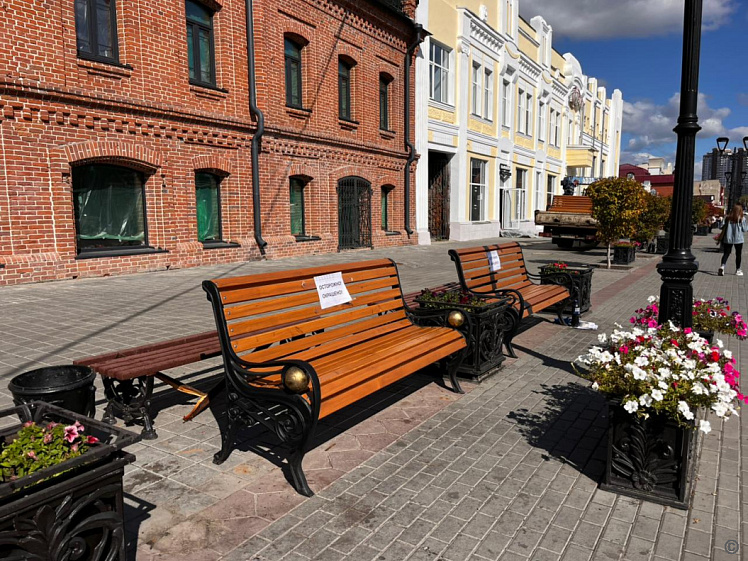 На боковых опорах лавочек разместили символы, отражающие основную деятельность предпринимателей и купцов. До конца октября на них появится QR-код, ведущий на аудиогид.