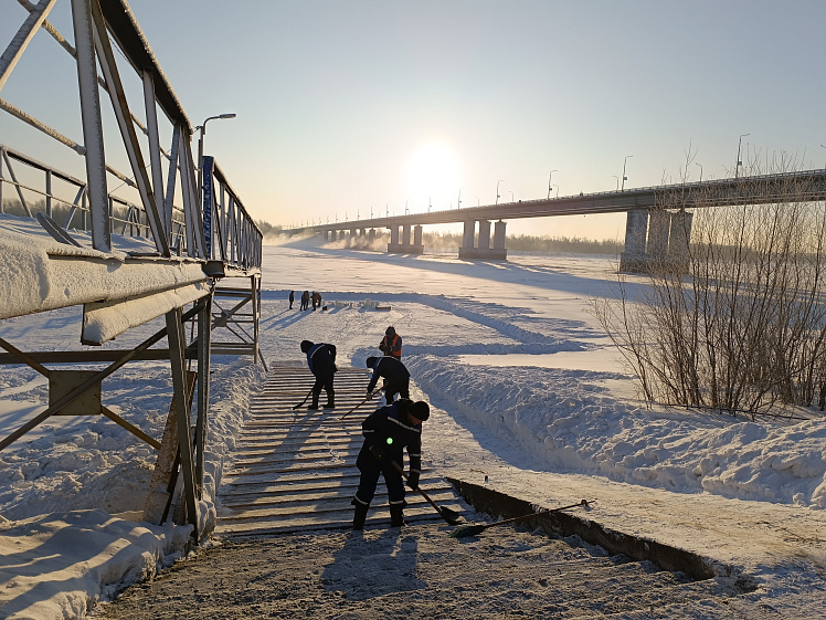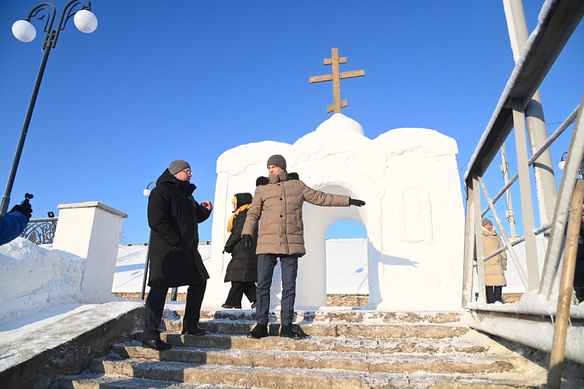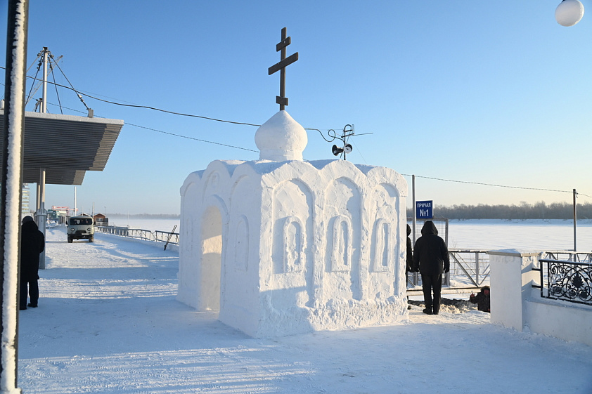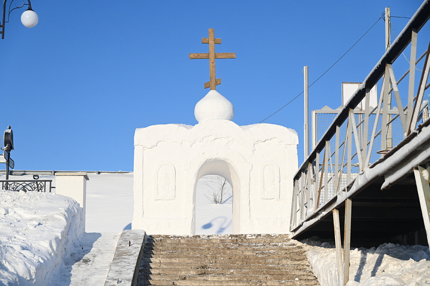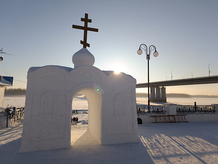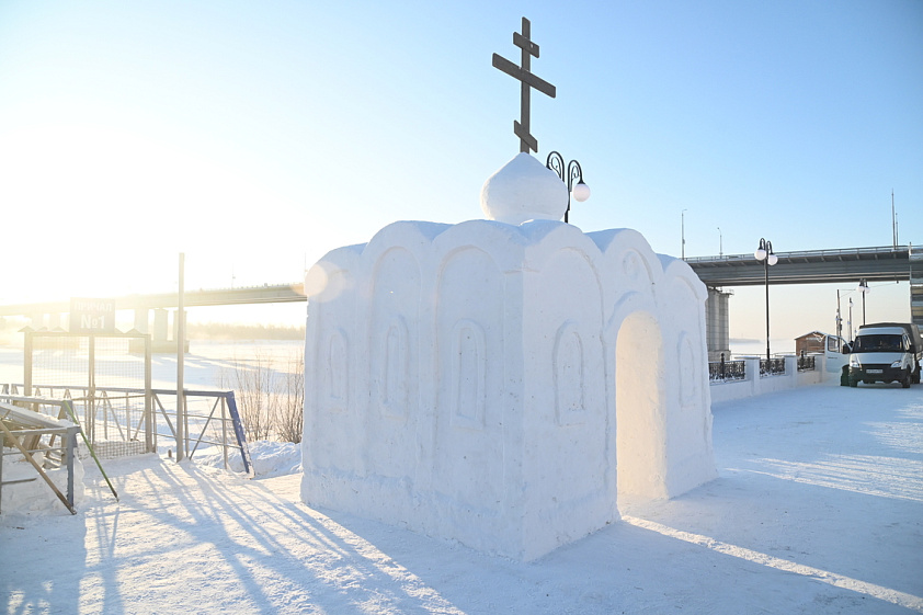 Сейчас в Крещенском городке ведутся последние приготовления к христианскому празднику. Специалисты МБУ «Благоустройство и озеленение» расчистили территорию от снега, уложили деревянные мостки для прохода к воде, собрали и набили снегом короб для изготовления снежной часовни. К настоящему моменту снежная часовня уже готова — она расположена на набережной, на входе в Крещенский городок. Внизу, на площадке на льду, будет сделана иордань с крестом изо льда, купель для омовения. Работы по обустройству иордани начались в пятницу, 16 января: площадку разметили и начали вырезать лёд, чтобы получилась прорубь в форме креста: именно здесь в праздник Крещения состоится чин водосвятия, после которого вода считается освящённой.