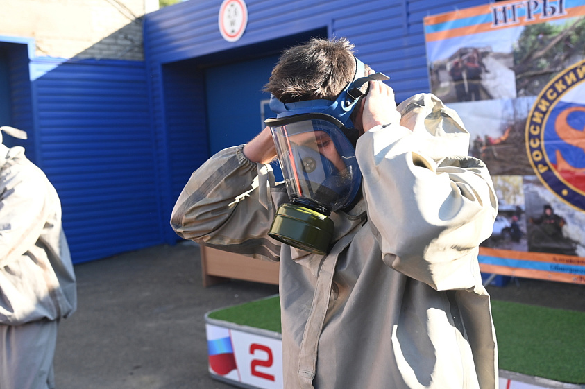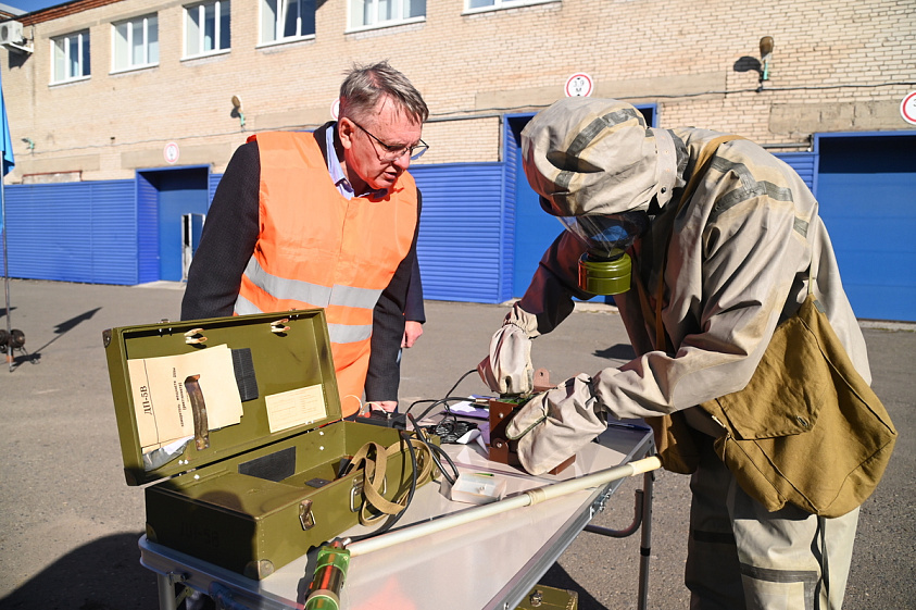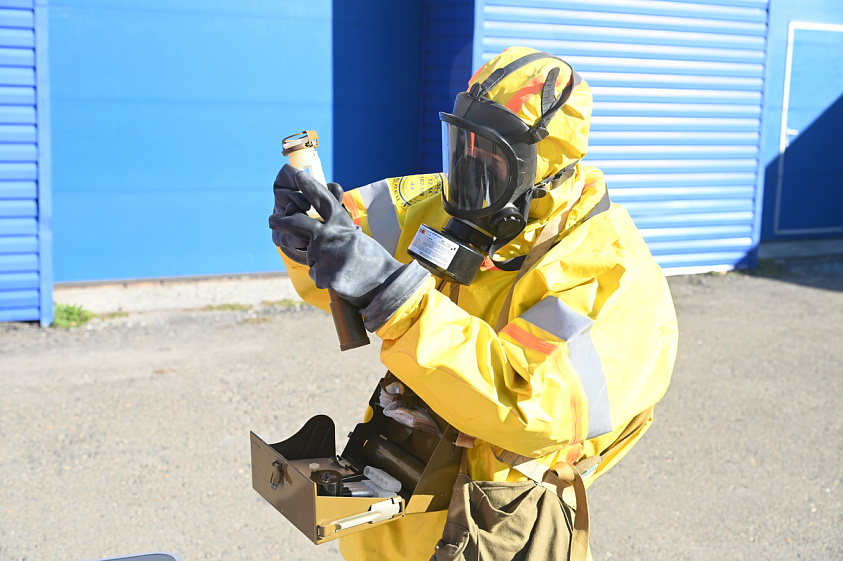 Самой зрелищной, пожалуй, стала локация «Пост радиационного и химического наблюдения». Участникам предстояло правильно и строго за отведенное время надеть костюмы химзащиты, противогазы и выполнить поставленные в рамках учебного сценария задачи. Особенно впечатляло, как в толстых резиновых перчатках и масках специалисты ловко управлялись с маленькими пробирками с реактивами.