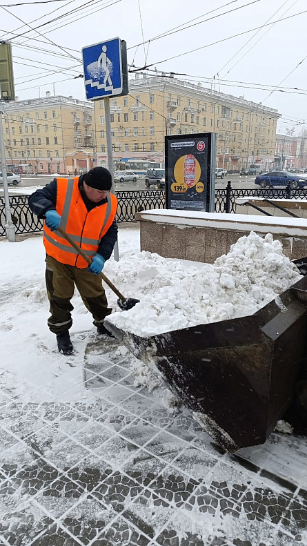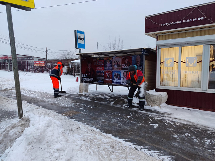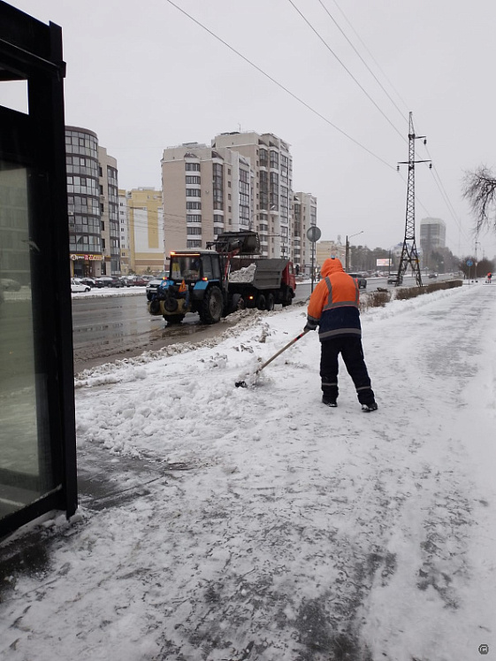 Днём дорожники продолжают убирать снежные кучи. Они работают на остановках и подходах к переходам. Бригады трудятся во всех районах города.