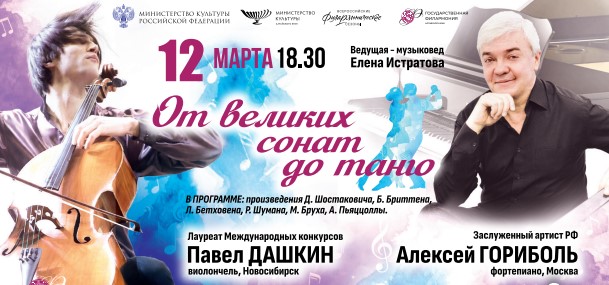 В четверг, 12 марта, в Государственной филармонии Алтайского края на сцену выйдут заслуженный артист России Алексей Гориболь (фортепиано, Москва) и солист Новосибирской государственной филармонии Павел Дашкин (виолончель, Новосибирск).