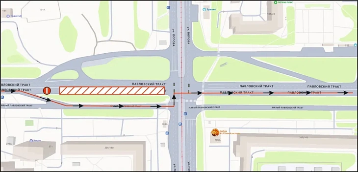 транспорт, движущийся от ул. Солнечная Поляна в сторону ул. Георгиева, будет выполнять правый съезд на малую проезжую часть Павловского тракта и затем возвращаться на основную проезжую часть магистрали по временным линиям дорожной разметки в границах перекрёстка с ул. Попова;