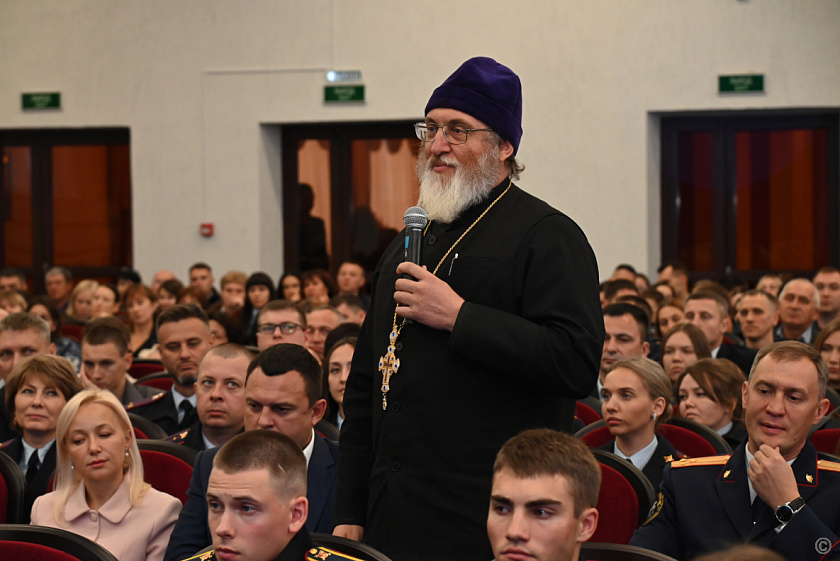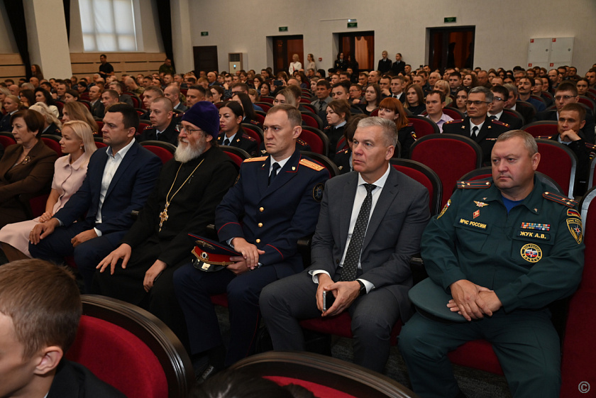 В актовом зале института состоялась встреча гостя с представителями органов власти и силовых структур Барнаула и Алтайского края, общественных организаций, ветеранами специальной военной операции, курсантами и сотрудниками вуза.
