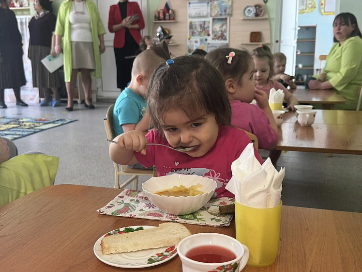 После осмотра групп комиссия поприсутствовала на обеде ребят. Сегодня их кормили овощным супом с мясом птицы, на второе был гарнир из перловой крупы, гуляш из говядины и свежие овощи. Дети кушали с удовольствием.