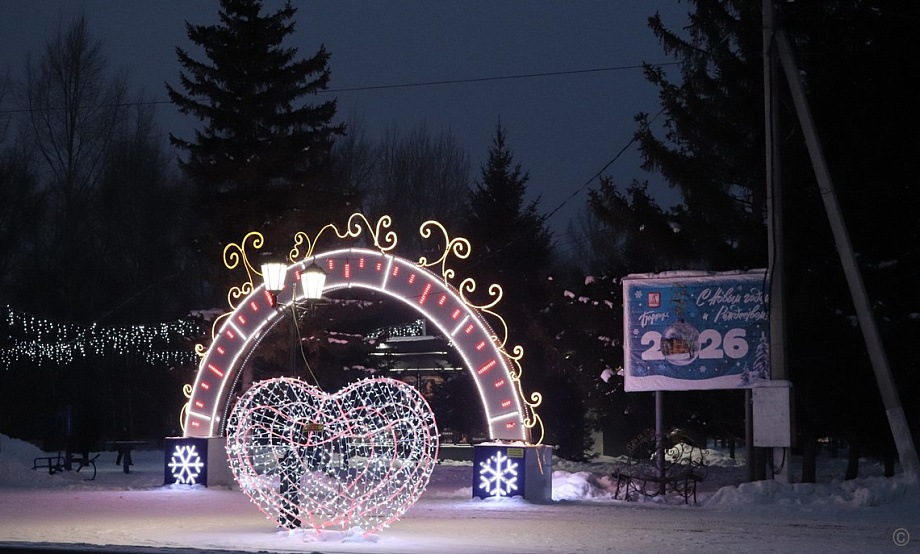 Районы Барнаула продолжают оформлять к Новому году. На главной площадке Ленинского района — площади Мира — появилась 12-метровая искусственная ель, на её ограждении разместили баннеры, смонтировали световой потолок, установили разные световые фигуры.