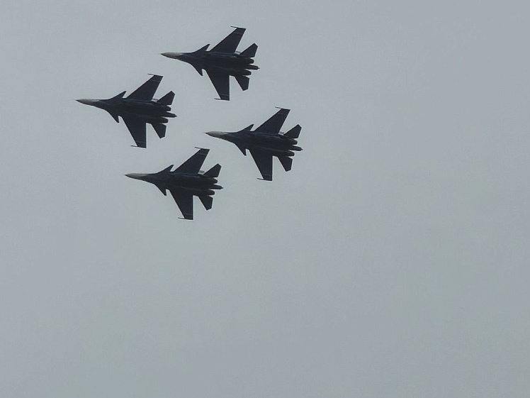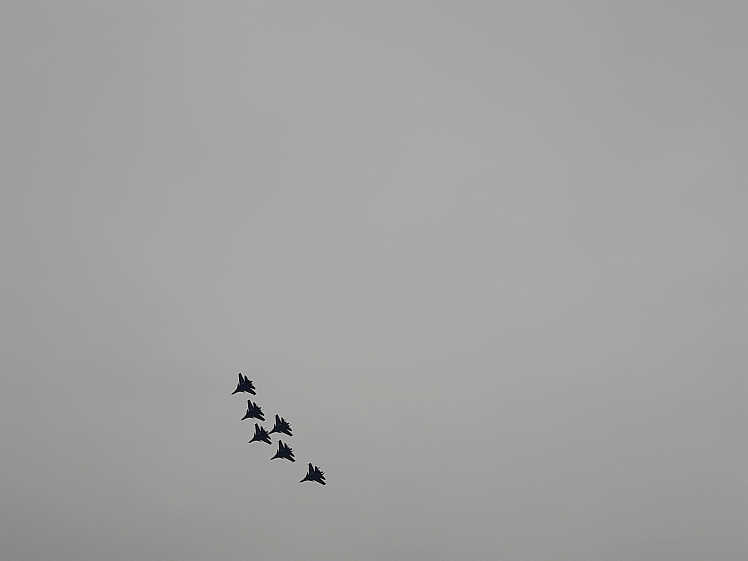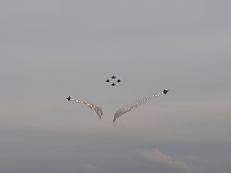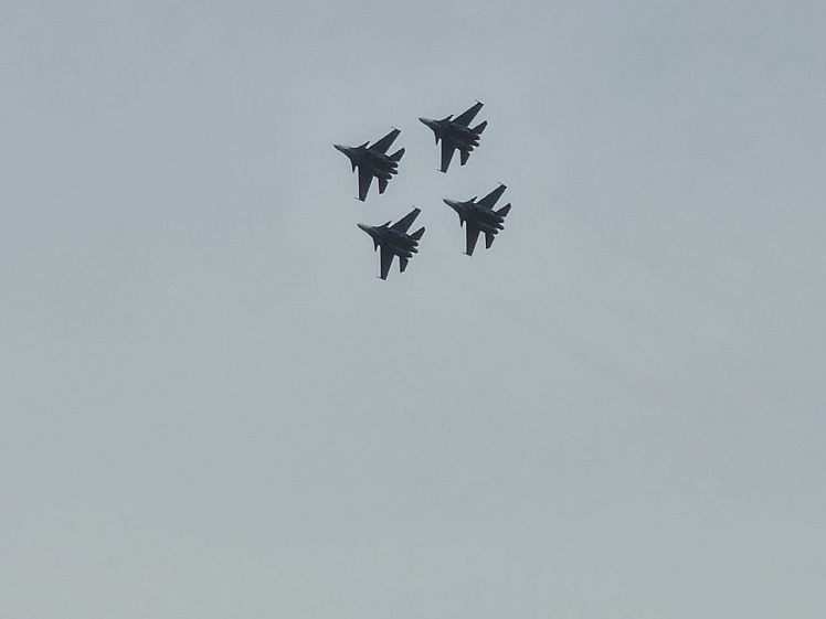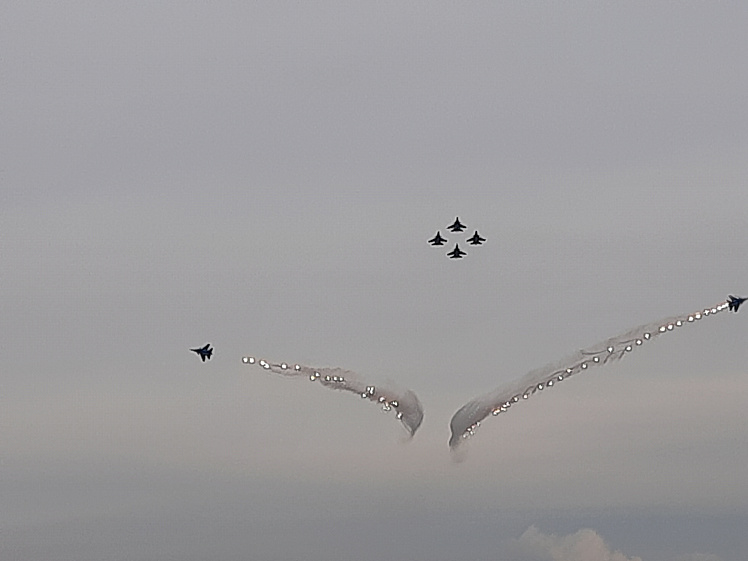 Началось шоу небесных ассов с полётов шестёрки тяжёлых истребителей Су-30СМ. Лётчики выполняли элементы высшего пилотажа, находясь в метре друг от друга. Легендарные бочки, петли Нестерова, вращения вокруг своей оси, и всё это, не нарушая строя. Затем два самолёта эффектно покинули строй, показав парный роспуск, когда два самолёта разлетаются в стороны, а четвёрка продолжает полёт.