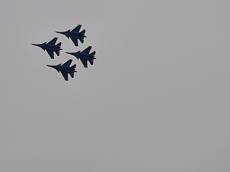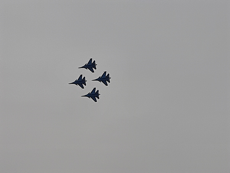После этого лётчики показывали высший пилотаж на четырёх самолётах и, наконец, настала очередь двоек. Встречные полёты, когда лётчики идут словно на таран, летя навстречу друг другу, и эффектно разлетаются, вызвали крики восторга. Не менее потрясающим был параллельный пролёт, когда одна машина летит над другой, перевернувшись вверх шасси. А уж «кобра», когда самолёты, словно ракеты, устремляются в небо и комментатор отсчитывает сброс скорости: 250, 200, 150, 100, 50, ноль — и самолёты зависают в небе неподвижно, а затем летят хвостами вниз. Это управляемое падение невозможно передать словами, когда асы играючи удерживают тяжеленные машины в небе и как ни в чём не бывало разлетаются. А эффектный вертикальный фонтан, когда самолёты выпускают снопы искр и разлетаются, оставив в небе росчерк, словно подпись, просто невозможно забыть.