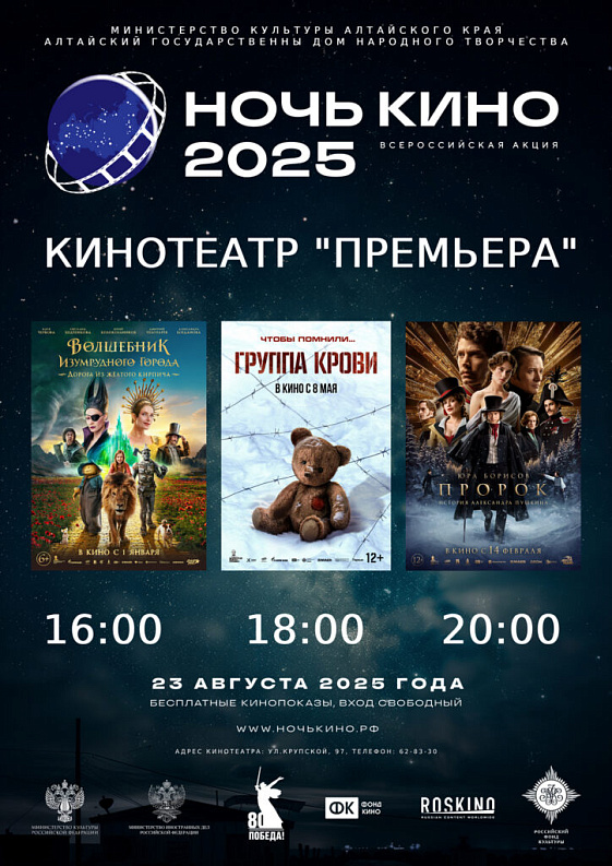 Для бесплатных публичных показов были выбраны три самых успешных отечественных премьеры 2025 года: военная драма в честь 80-летия Победы в Великой Отечественной войне — «Группа крови», семейное фэнтези «Волшебник Изумрудного города. Дорога из жёлтого кирпича» и музыкальный байопик «Пророк. История Александра Пушкина».