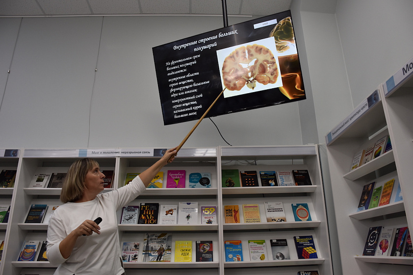 Кстати, эта выставка не только иллюстрирует список тем о мозге и вокруг мозга. Она носит просветительский характер и предполагает встречи с людьми, чья профессия связана с этим органом. Так, в день открытия перед читателями выступила кандидат биологических наук, доцент кафедры зоологии и физиологии Института биологии и биотехнологии АлтГУ Инна Воронина. Именно ее лекция стала своего рода путеводителем в мир мозга, в котором завораживает не только красота и упорядоченность, но и сложность его устройства, грандиозность замысла.