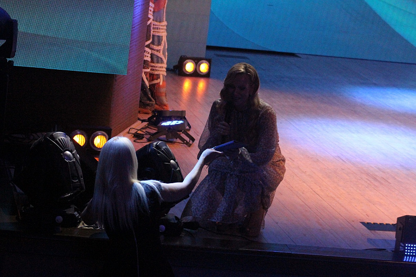 Отвечала звезда кино и на вопросы зрителей. Участники встречи спрашивали о том, как она выбирает роли, о работе в сериале «Журов», где её партнёром был Андрей Панин, о певческой карьере.