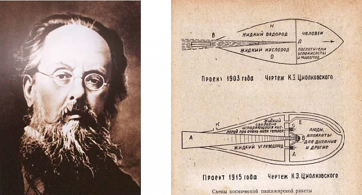 Русский ученый и изобретатель Константин Циолковский (1857–1935) являлся весьма оригинальной фигурой в российском космическом движении. Он предвидел искусственные спутники, ракеты и орбитальные станции задолго до того, как это стало реальностью. Первое изображение «реактивного прибора» работы Циолковского должно было появиться в журнале «Научное обозрение» ещё в 1903 году, но непонятный тогда чертёж, как это часто бывает, не вошёл в печать и был опубликован лишь в 1962 году.