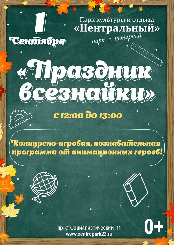 1 сентября в 12:00 в парке «Центральный» состоится яркое событие «Праздник всезнайки». Это мероприятие посвящено Дню знаний.