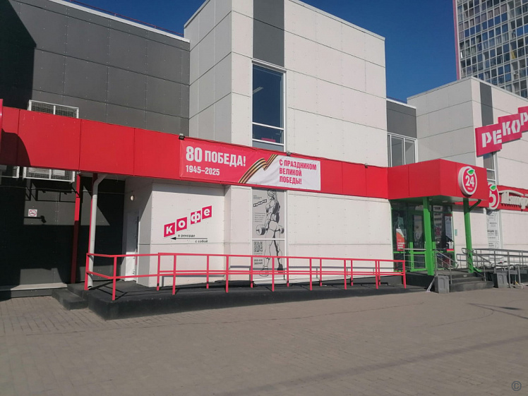 Здания и витрины предприятий города украсили в соответствии с брендбуком празднования 80-летия Победы. Базовым элементом оформления выступил логотип памятника «Родина-мать зовёт!».
