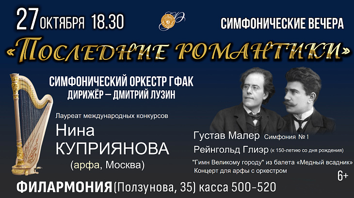 В Государственной филармонии Алтайского края отметят юбилеи двух великих композиторов – последних романтиков в музыке конца XIX – начала XX века. Речь идёт о 150-летии Рейнгольда Глиэра, в честь которого в рамках программы прозвучит концерт для арфы с оркестром и фрагмент из балета «Медный всадник», и 165-летии Густава Малера, чей юбилей симфонический оркестр отметит исполнением Симфонии № 1.