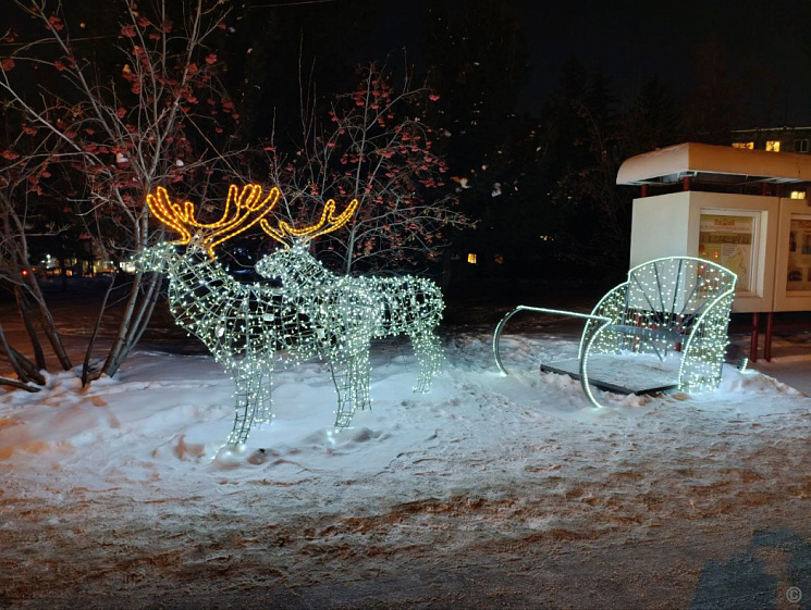 В сквере 60-летия СССР установили «Светодиодное дерево» и фигуры «Олени с санями», на проспекте Красноармейском — инсталляцию «Павлин».