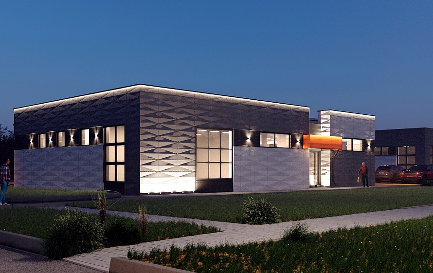 Изначально заказчик планировал разместить на принадлежащем ему участке два двухэтажных здания. В первом корпусе хотели разместить офис, санитарно-бытовые помещения и склад. Во втором — только санитарно-бытовые комнаты и склад. Наружные стены проектировали из сэндвич-панелей с облицовкой фасадными кассетами и линеарными панелями.