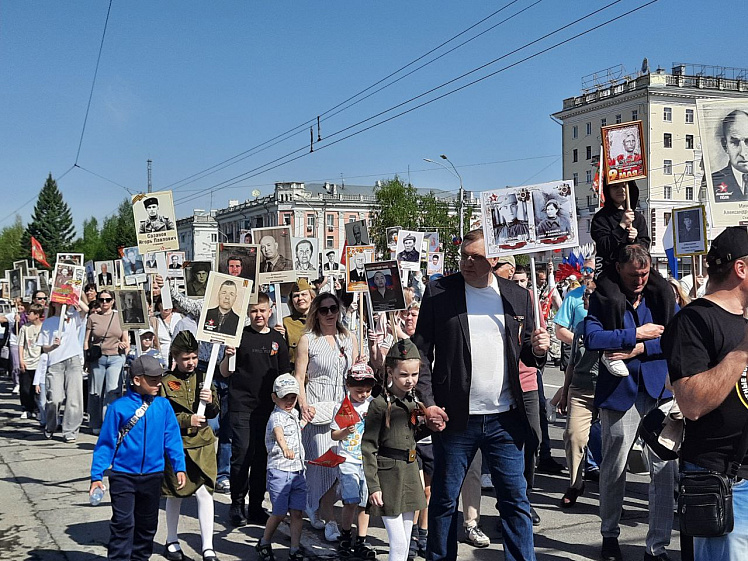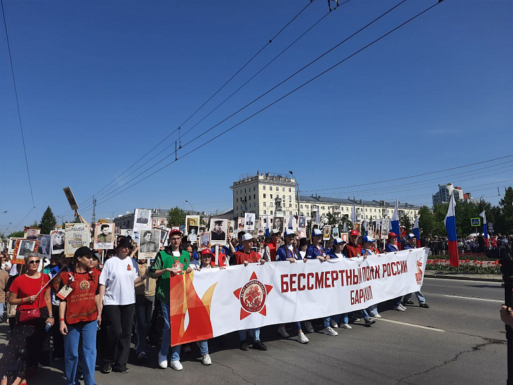 Барнаульцы пронесли Знамя Победы с именами своих близких на шествии «Бессмертного полка» по проспекту Ленина.