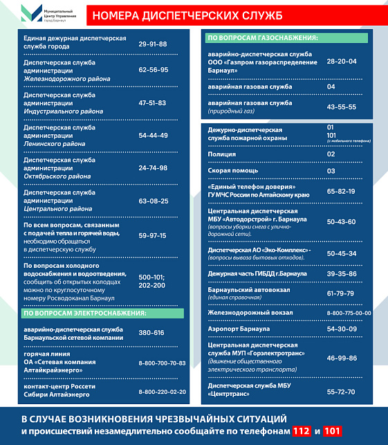 Для жителей Барнаула в преддверии длинных выходных сделали полезную шпаргалку с номерами диспетчерских служб, горячих линий и аварийных служб.