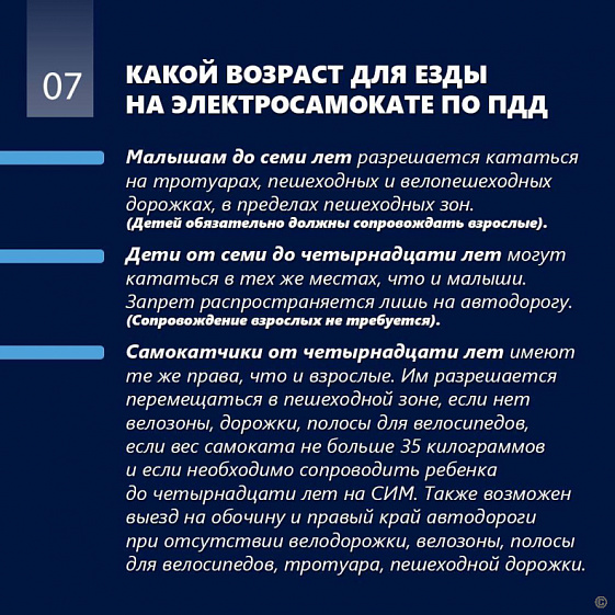 - Самостоятельно передвигаться по тротуарам и велодорожкам на электросамокатах разрешено в 7–14 лет.