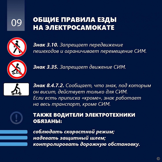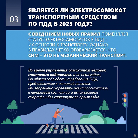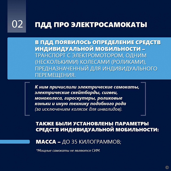 Электросамокаты официально признаны средствами индивидуальной мобильности (СИМ). Это транспортные средства с электродвигателем, вес которых не превышает 35 кг, а мощность — 0,25 кВт. Водители электросамокатов теперь считаются участниками дорожного движения, а не пешеходами.