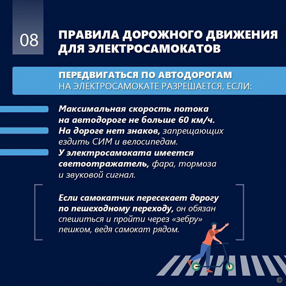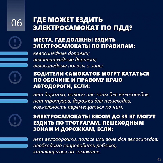 Приоритетом считаются велодорожки и пешеходные зоны. Если такие отсутствуют, то двигаться следует по обочинам или правому краю дороги с ограничением 60 км/ч. На тротуарах скорость не должна превышать 20 км/ч.