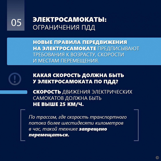 Максимальная скорость на электросамокатах может достигать 25 км/ч. На дорогах, где скорость движения превышает 60 км/ч, запрещено движение. Это касается участков, где установлены знаки 3.10 («Движение пешеходов запрещено») и 3.35 («Движение на электротранспорте запрещено»).