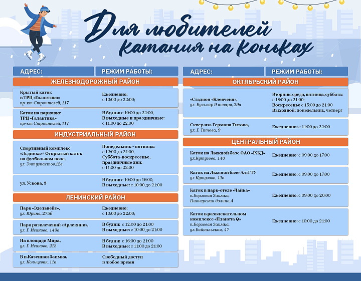 Всего в столице Алтайского края функционирует 16 катков, 11 лыжных баз и 33 хоккейные коробки. Их адреса указаны в прикреплённых ниже карточках — выбирайте ближайший и скорее отправляйтесь, чтобы хорошо провести время на свежем воздухе.