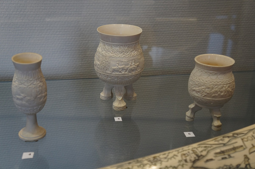 Так, в одной из витрин можно увидеть небольшую скульптурку «Мальчик с кувшином», созданную в 1970-х годах художником Александром Письменных. Выполнена она в необычной технике «бисквит», когда не покрытый глазурью фарфор становится похожим на мрамор. Интерес к этой технике возник ещё в XVIII веке, во времена господства в искусстве идей классицизма.